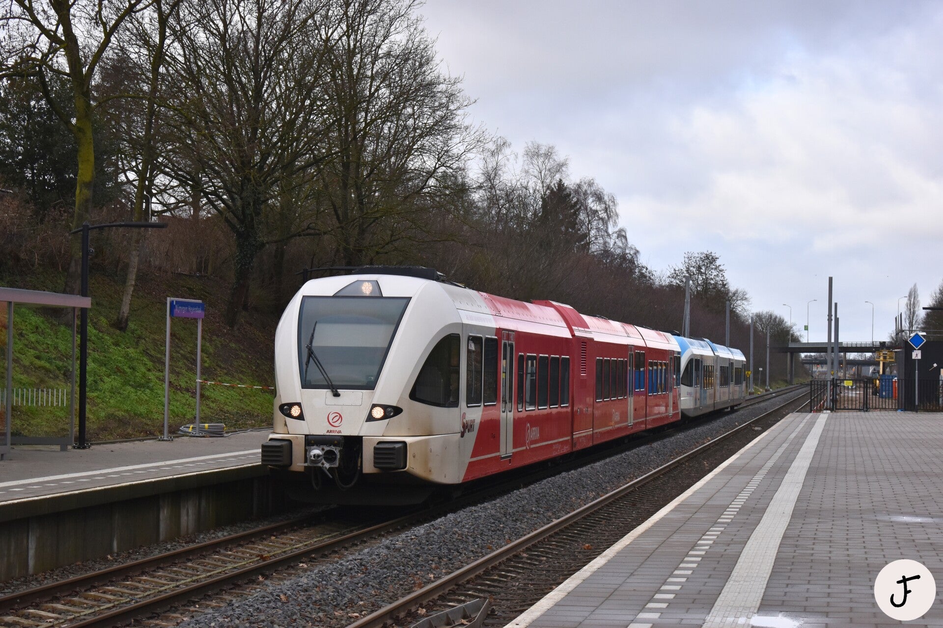 Nijmegen Heyendaal, 17 februari 2026. Arriva GTW 373 + 394 komen aan als RS11 32337 naar Cuijk. Deze extra trein reed ter versterking tijdens de Kuukse elfkroegentocht.