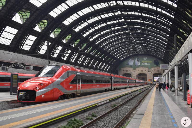 Milano Centrale, 7 maart 2023. Trenitalia ETR 700 4802 staat klaar voor vertrek als Frecciarossa 9717 naar Venetië Santa Lucia. De treinstellen uit deze serie zijn eigenlijk voor NS en NMBS gebouwd voor de Fyra-diensten, en daar stond de serie bekend onder de benaming V250. Door verschillende problemen zijn deze stellen weer teruggegaan naar de Italiaanse fabrikant AnsaldoBreda. Na aanpassingen zijn deze stellen verkocht aan Trenitalia.