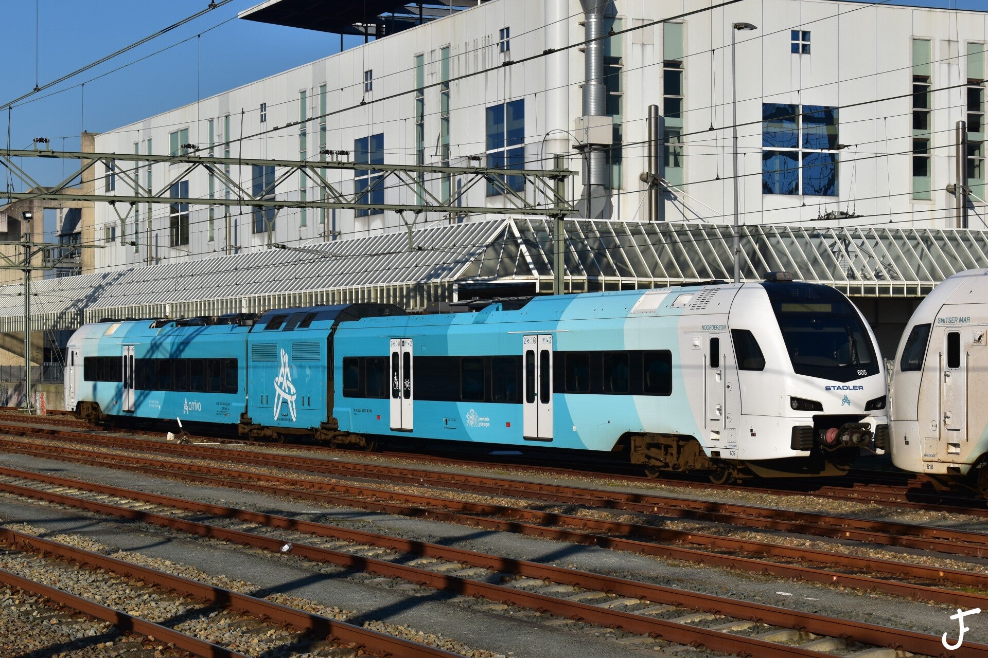 Leeuwarden, 11 maart 2022. Begin 2022 is dit treinstel geschikt gemaakt voor het rijden op accu's. 24 en 25 februari 2022 zijn er proefritten gereden tussen Almelo en Mariënberg en tussen Arnhem en Doetinchem. Op de koppen van dit treinstel zijn naast de gebruikelijke Arriva logo's nu ook Stadler logo's geplaatst. Voor de 605 staat de 618 eveneens te wachten op de volgende inzet.