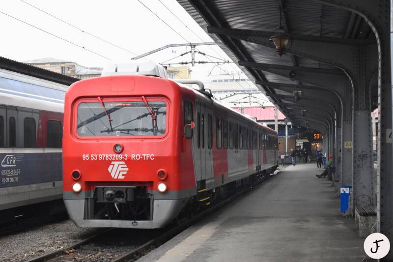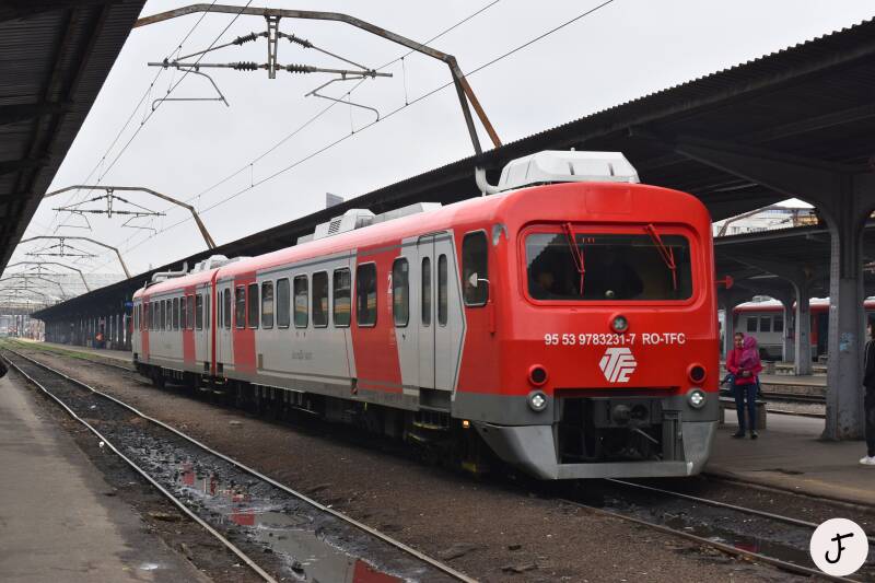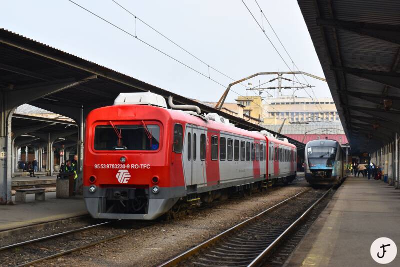 București Nord 🇷🇴, 27 maart 2025. Transferoviar Călători DH-2 3230-3231 (ex 3230) tijdens vertrek van het noordstation van de Roemeense hoofdstad als R 10165. Volgens de treinaanwijzer op het perron naar Pietroșița, maar volgens de website van TFC zou deze trein niet verder rijden dan Doicești. Rechts een Desiro van CFR Călători.