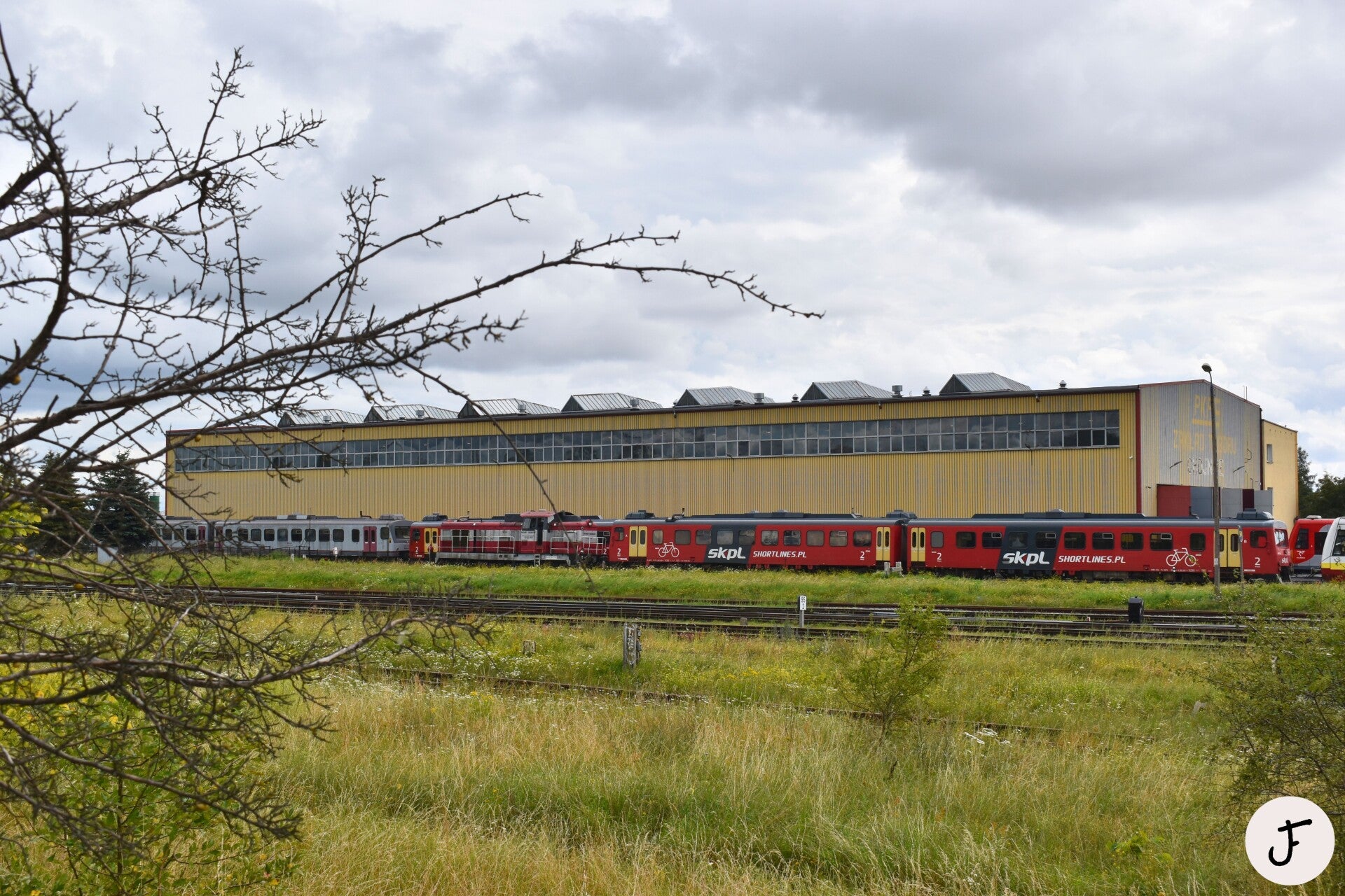 Chojnice 🇵🇱, 20 augustus 2025. SKPL SN83-004 naast het depot in Chojnice. Daarachter staat diesellocomotief SU42-533 en SN83-002 (ex 3207). Dit treinstel is nog steeds voorzien van de grijze kleurstelling waarmee deze in 2010 voor het eerst in Polen werd ingezet.