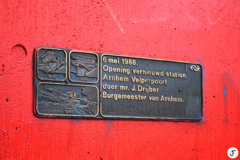 Arnhem, 23 januari 2016. Een plaquette ter ere van de opening van het stationsgebouw in 1988. Op de plaquette zijn ook de twee voormalige stationsgebouwen te zien. In 1892 werd het eerste station Arnhem Velperpoort geopend. Dit houten gebouw is tot 1918 meegegaan, toen is het station gesloten. In 1953 werd Arnhem Velperpoort heropend met een gebouw van de hand van Koen van der Gaast. In 1988 is het huidige station geopend, maar het gebouw uit 1953 is blijven staan.