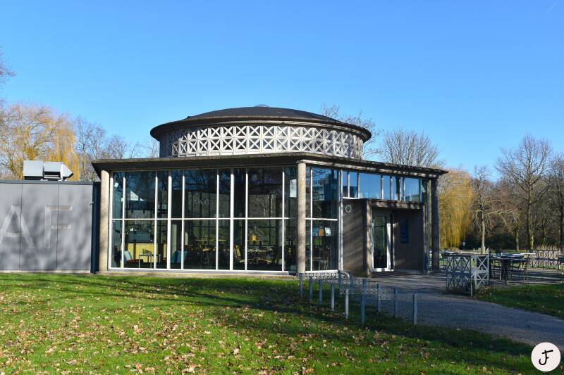 Arnhem, 7 februari 2023. Het kenmerkende entreegebouw van het vorige station Arnhem, architect H.G.J. Schelling, is verplaatst naar een park in de wijk Presikhaaf. Thans is er de horecagelegenheid T-huis in gevestigd. Foto's van het huidige Arnhem Centraal zullen nog volgen.