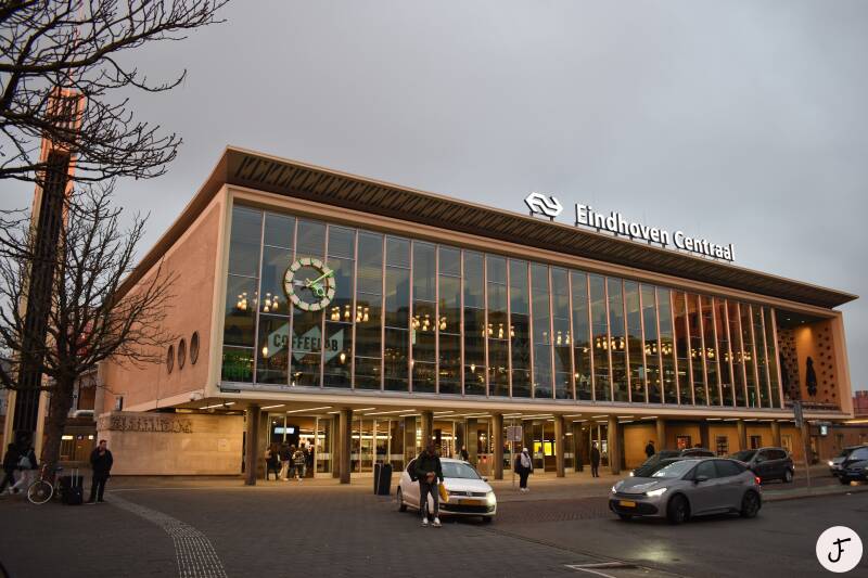 Eindhoven, 16 december 2022. Het door Koen van der Gaast ontworpen gebouw werd in 1956 geopend. In 2018 werd gerestaureerde station heropend en kreeg het station ook de toevoeging Centraal.