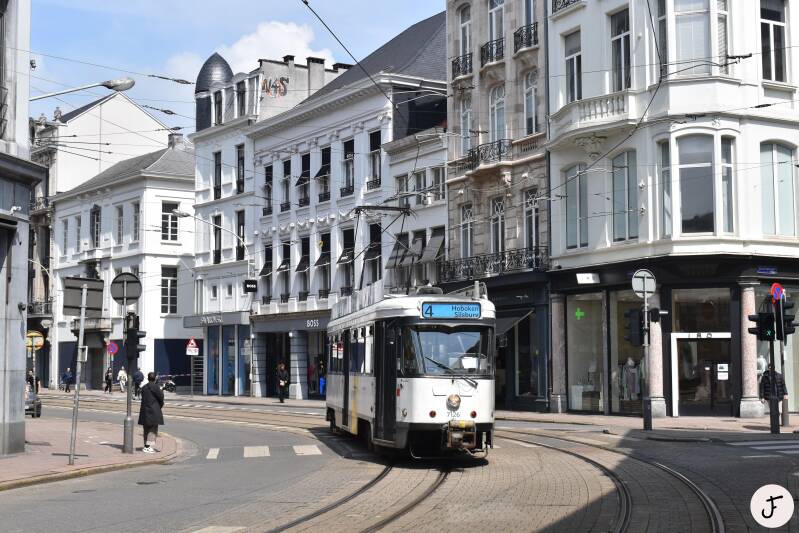 Antwerpen, 11 mei 2023. PCC 7126 komt door de bocht in de Huidevettersstraat, en is onderweg als lijn 4 naar Berchem Station.