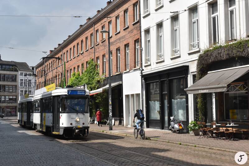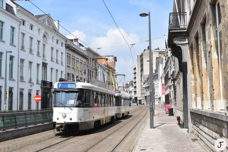 Antwerpen, 11 mei 2023. PCC's 7105 + 7117 in de Huidevettersstraat als lijn 7 naar Mortsel.
