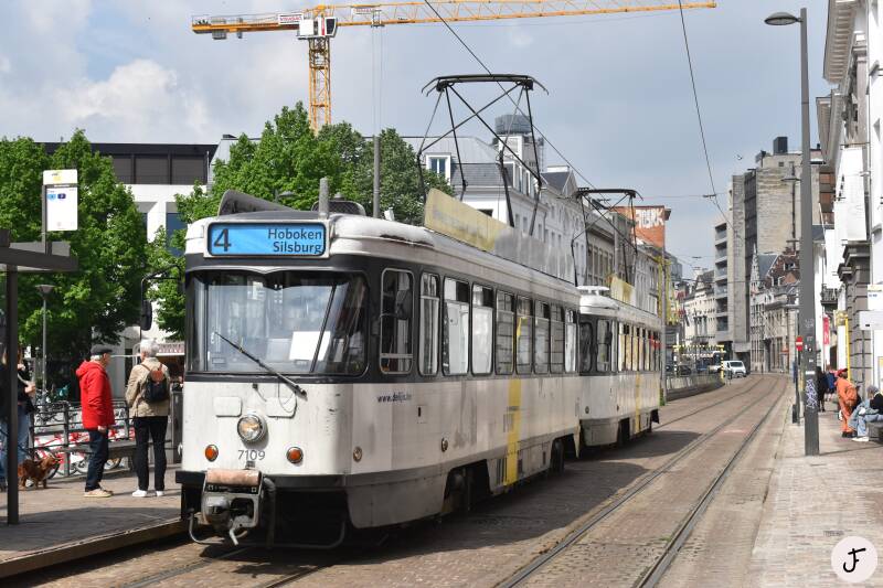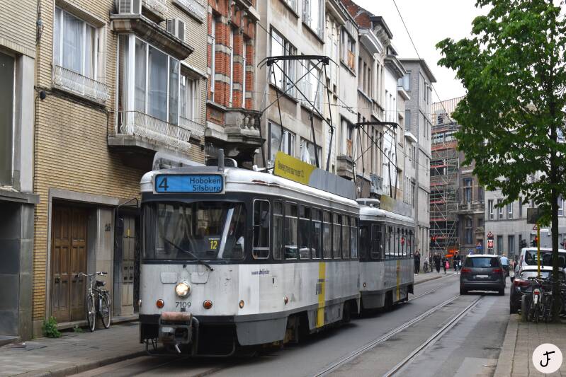 Antwerpen, 11 mei 2023. PCC's 7109 + 7084 als lijn 4 naar Hoboken.