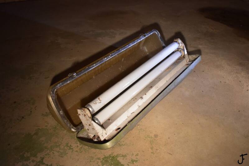 De driehoekige vorm van de lichtkap maak het mogelijk dat hier drie TLS lampen van 20 watt in geplaatst zouden kunnen worden...